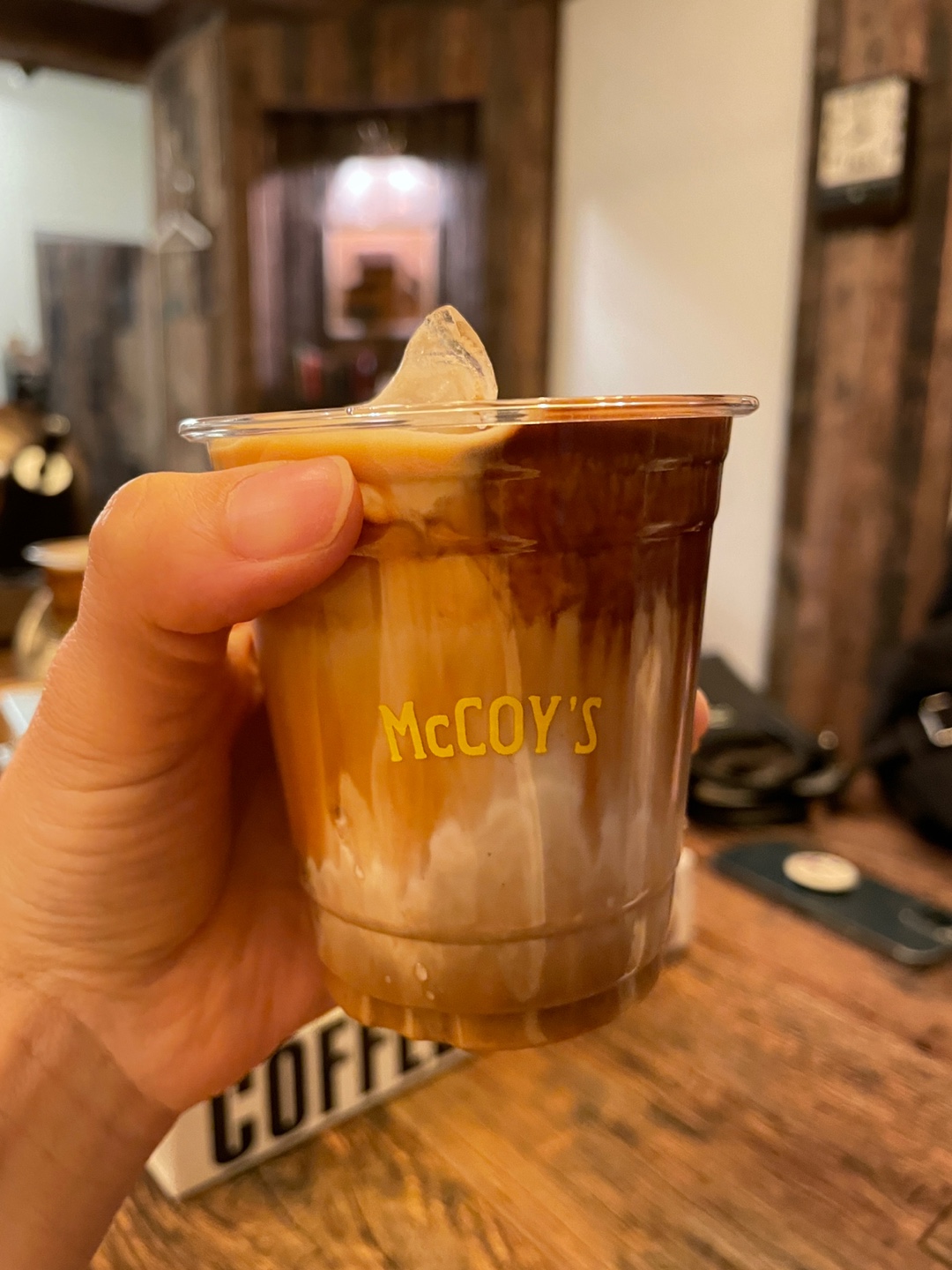 시그니처인 맥코이 커피를 주문했다. 사이즈는 스타벅스의 더블샷 라테와 비슷한 사이즈였고 총 3개의 층으로 한 잔이 완성된다. 1층부터 우유, 에스프레소, 크림. 특히 제일 위층 크림이 달달한 카랴멜 향과 맛이어서 식후에 먹기 안성맞춤이었다. 커피는 약간 산미가 느껴졌지만 라테 유형의 맥코이 커피이기 때문에 부드러운 커피와 아주 잘 어울렸다. 맥코이 커피는 시그니처라 할만하다.