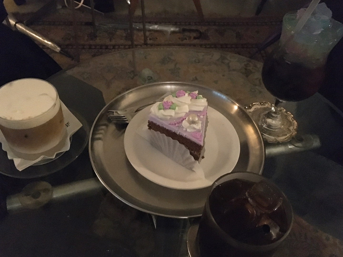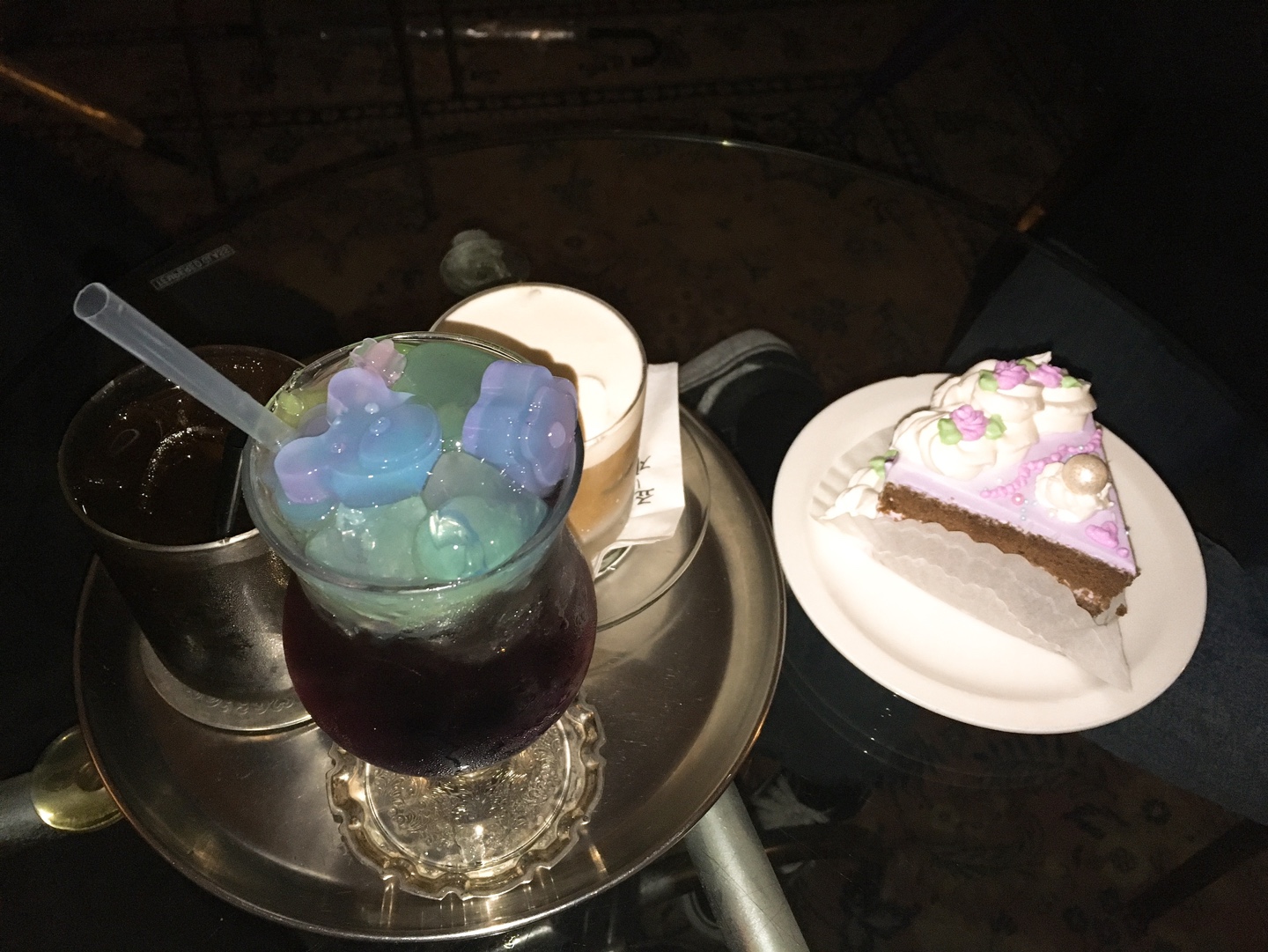 비주얼만으로는 상상 안 가는 퓨로룡 소다(거봉 맛)와 케익 맛은 의외로 덜 달아서 부담스럽지 않았다. 특히 포로룡은 보라, 초록, 연두, 파란, 분홍색의 수제 곤약 젤리의 비주얼이 시선을 압도하는 게 가장 큰 주문 요인이었다(젤리는 아무 맛도 나지 않는다). 이외 부드러운 크림이 있는 아인슈페너와 깔끔한 아이스 아메리카노도 친구들 모두 만족. 같이 시킨 케익과 조합이 좋았다.