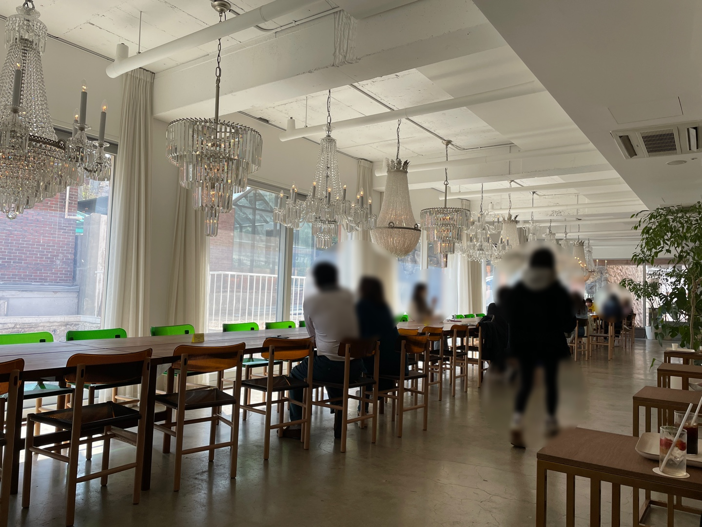 가장 눈에 띄는 건 카페 중앙에 거대한 샹들리에가 줄지어져 있다는 점이다. 그 길이에 맞춰 긴 테이블이 끊김 없이 연결되어 있는데 마치 유럽에 와 있는 기분이다. 테이블 옆으로는 벽면에 2인 단위로 앉을 수 있는 좌석도 마련되어 있다. 남산 자락의 여유와 공간의 유니크함이 예술가들의 집합 공간의 무드가 있다
