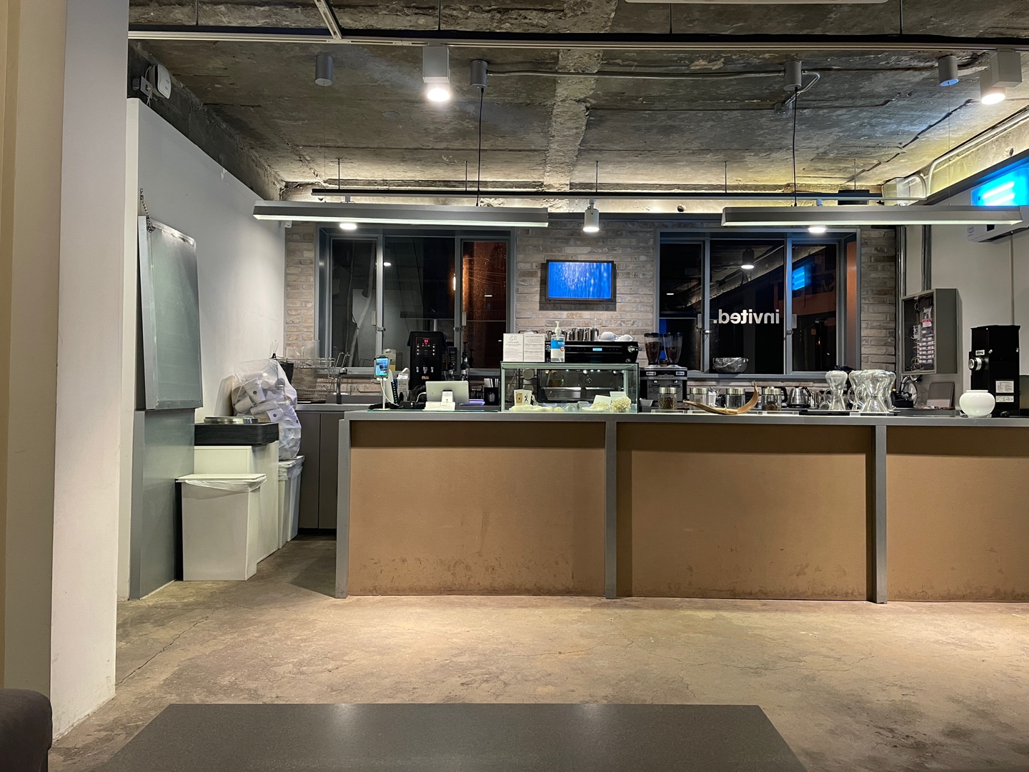 저녁에 방문한 인바이티드는 빨간 벽돌에 쏘아올린 외부 조명으로 굉장히 따뜻한 느낌이었고 내부는 화이트와 그레이 벽에 인바이티드만의 정체성을 표출하는 오브제와 톤 다운된 녹색의 로고로 안정적인 무드를 전달했다.