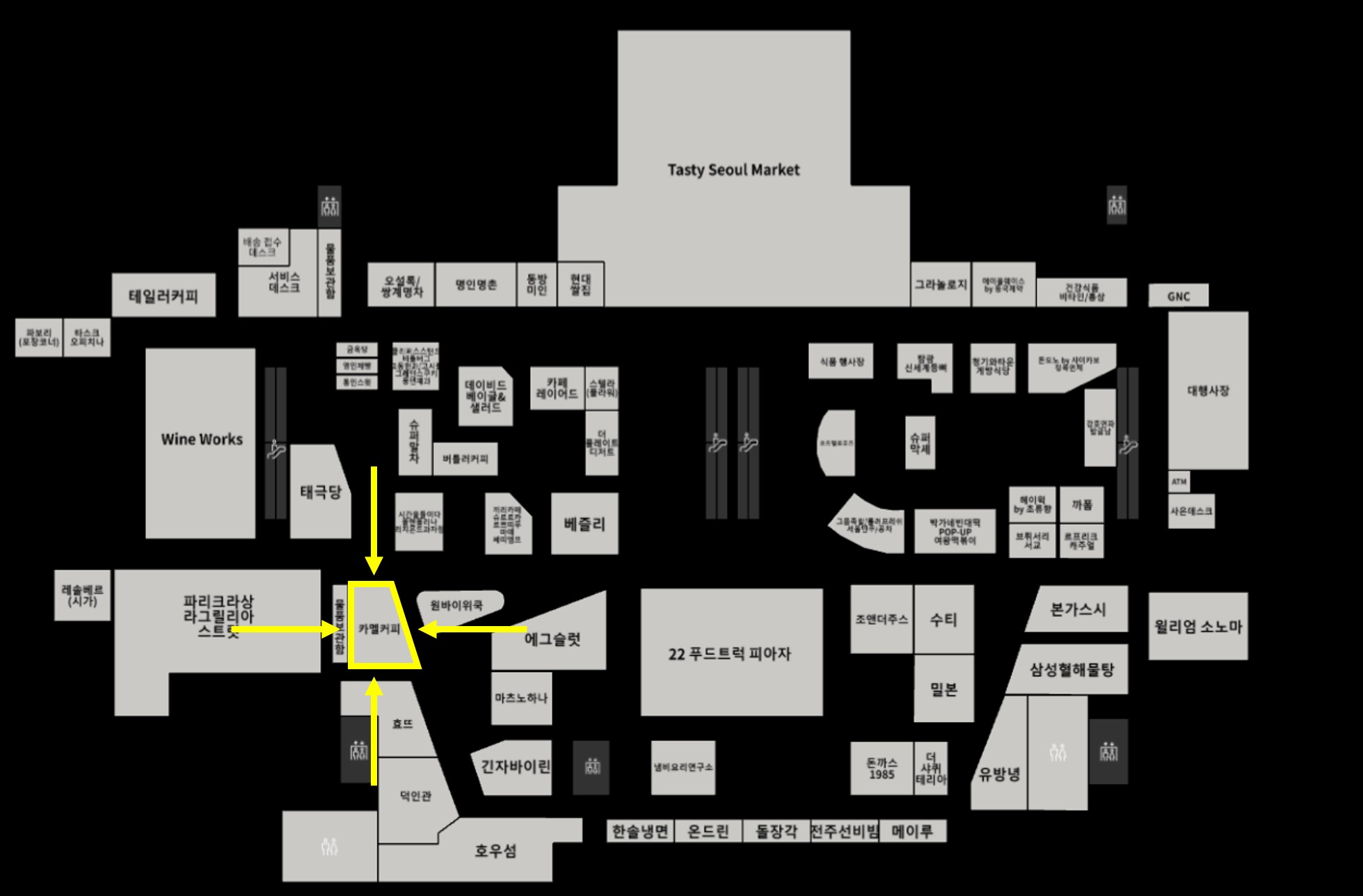 더 현대 서울의 식품관이 모여있는 지하1층에 자리하고 있다. 완전 중앙에 있는 건 아니지만 베이커리 브랜드가 모인 곳에 카페가 같이 있다. 인근 매장은 파리크라상, 태극당, 효뜨다(아래 매장 위치 참조)
