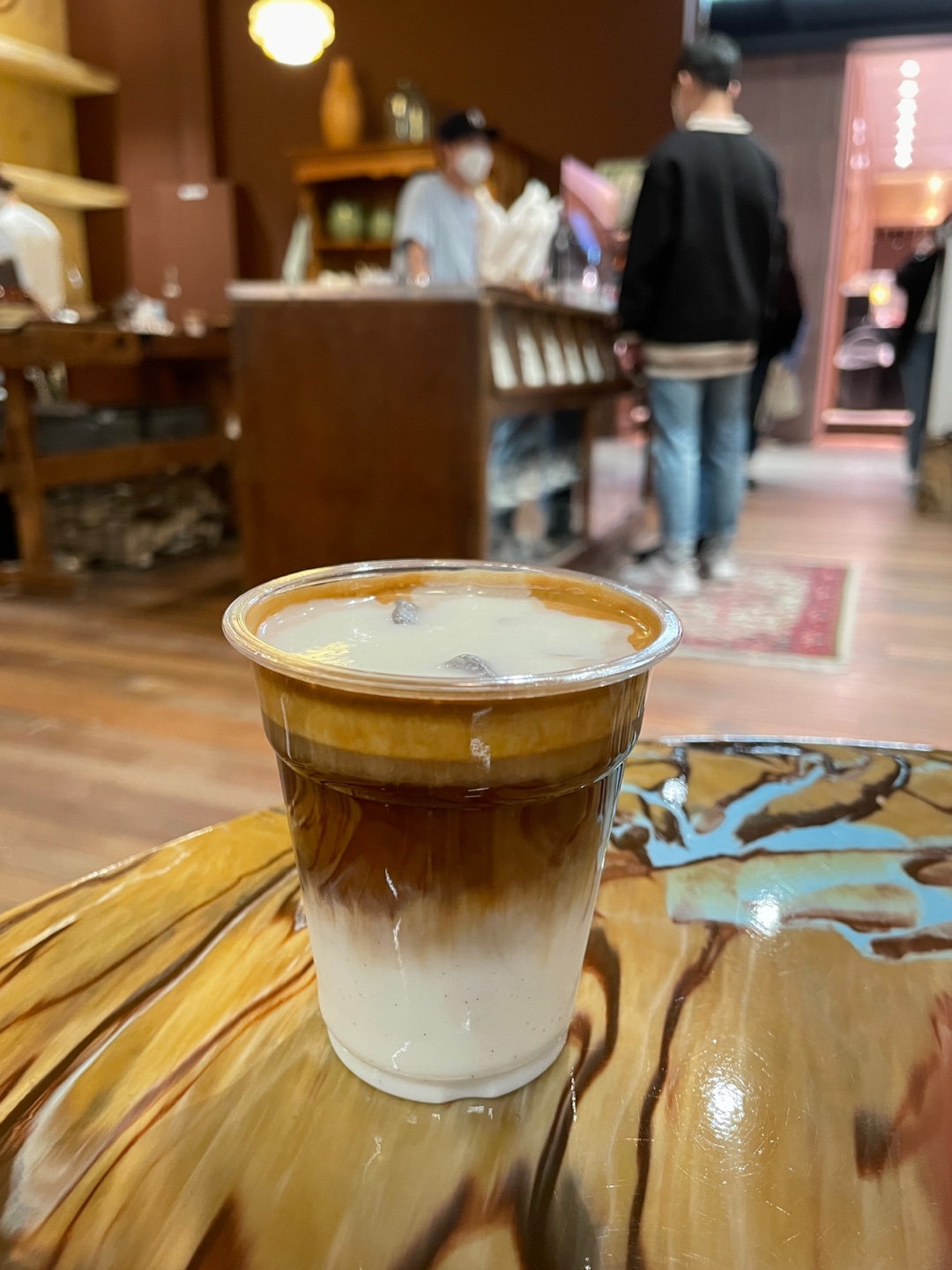 진한 플랫화이트 베이스에 카멜 커피만의 크림이 얹어져 부드러운 목 넘김을 보장한다. 원두는 산미가 있는 편이지만 비슷한 브랜드인 도렐커피보다는 약하다. 이곳에서 나는 카멜커피와 사이즈가 똑같은 연남동 맥코이 커피가 떠올랐다. 크림은 맥코이가 더 지-인하다.